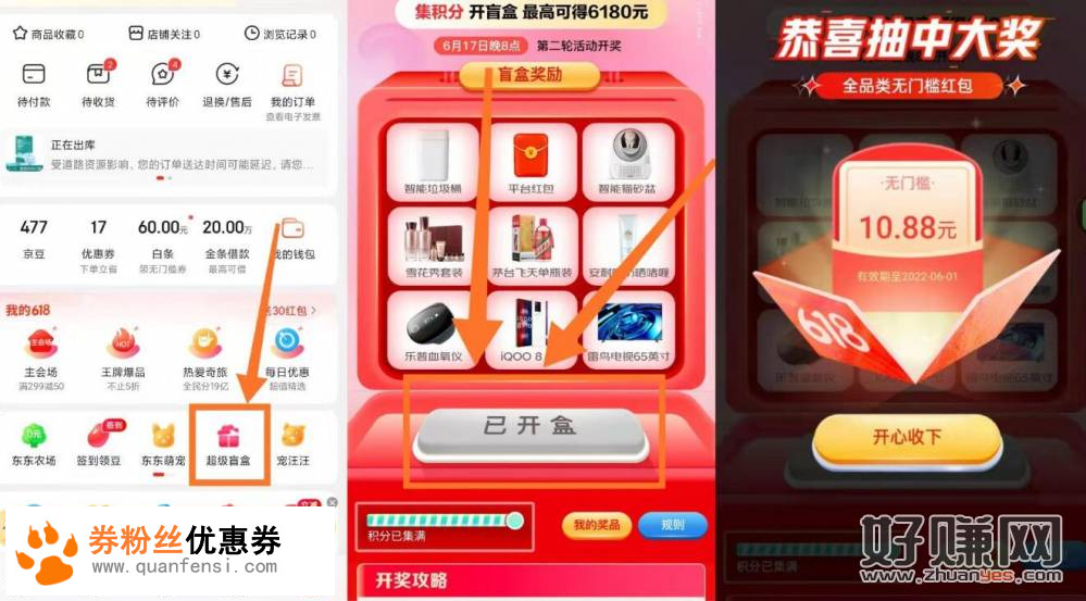 京东app-我的-超级盲盒,点签到开盲盒 去试试,必中!我中了8.88!是无门槛鸿包